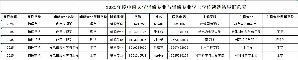中南大学物理学院2025年辅修专业和辅修专业学士学位拟录取结果如下:
