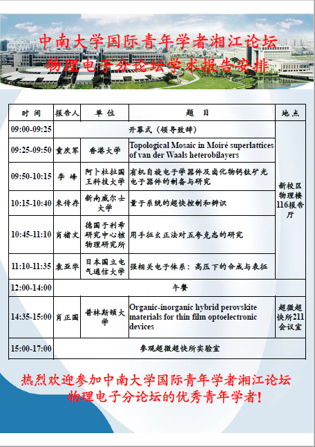 中南大学国际青年学者湘江论坛 物理电子分论坛学术报告安排