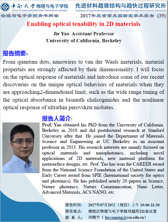 电 话:0731-88836457 传真:0731-88836457地 址:湖南长沙麓山南路中南大学物理学院 邮 编:410012