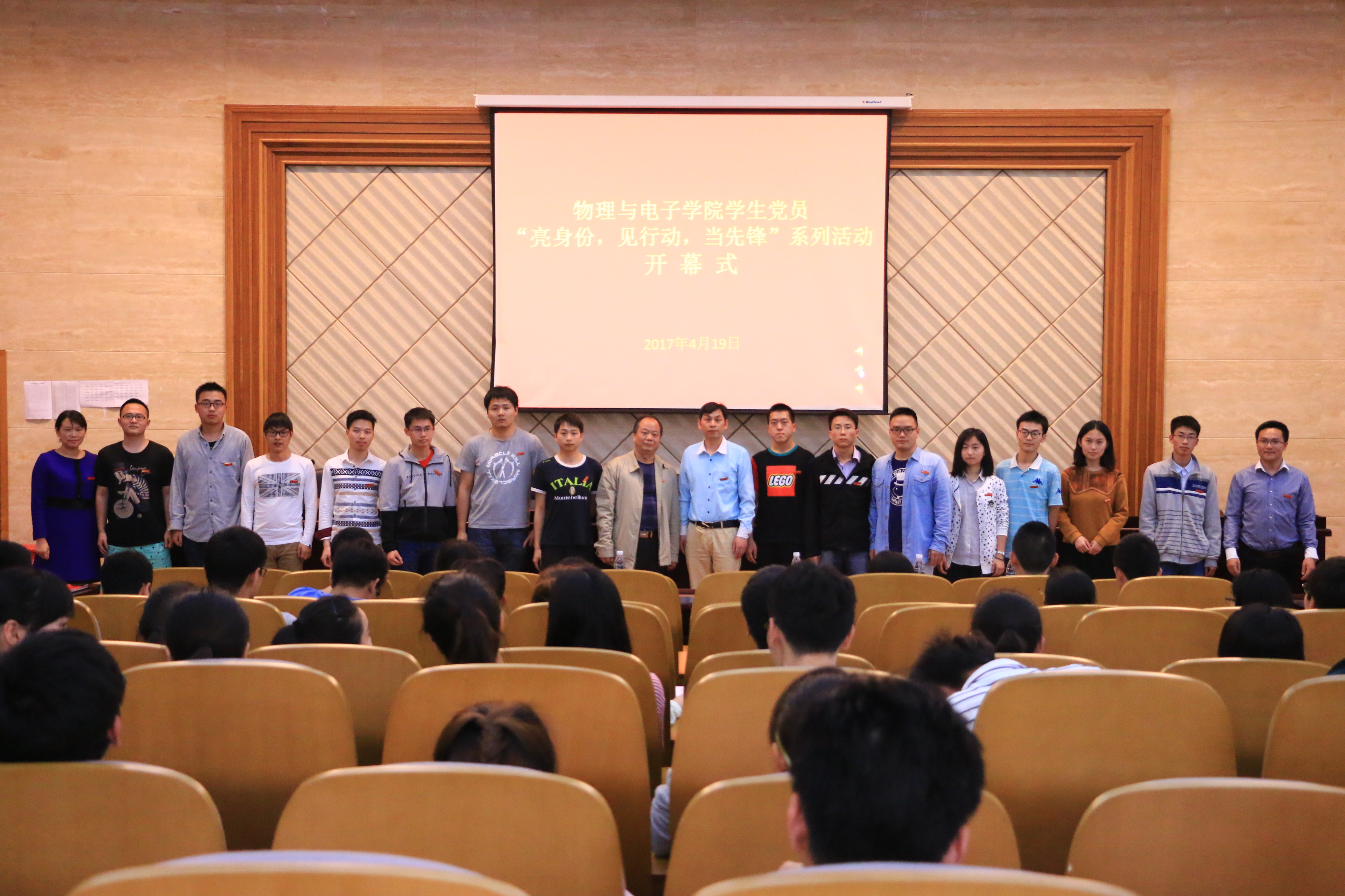 4月19日下午15:00,物理与电子学院学生党员“亮身份,见行动,当先锋”系列活动开幕式在物理楼116报告厅隆重举行。物电院党委书记许宏武、党委副书记谢群、党委委员兼组织干事申友桂、各年级辅导员以及全体学生党员共150余人参加了开幕式。