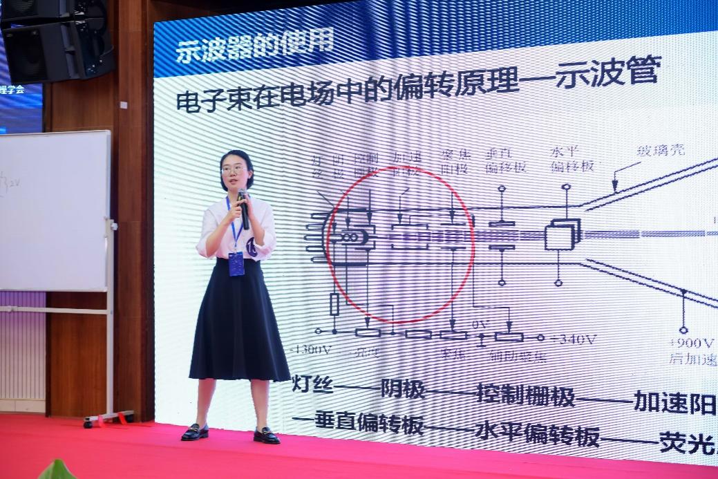 来自广西民族大学的陈哲耕老师则给大家展示了“示波器的使用”实验教学过程。她首先介绍了示波器的广泛应用,然后详细分析了模拟示波器各个部分的功能,阐明了示波器测量信号的工作原理,用示波器显示的优雅、美丽的李萨如图形来引导学生去探索广泛存在于自然界中的美丽。