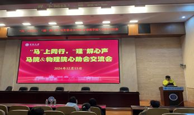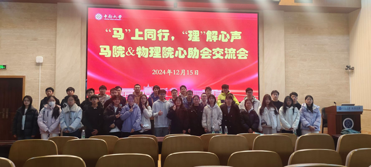 12月15日下午,马克思主义学院与物理学院联合举办的心助会工作交流会在物理楼116报告厅顺利举行。本次活动以“‘马’上同行,‘理’解心声”为主题,两院心助会成员齐聚一堂,围绕工作模式、特色活动及实践经验进行深入分享与探讨。