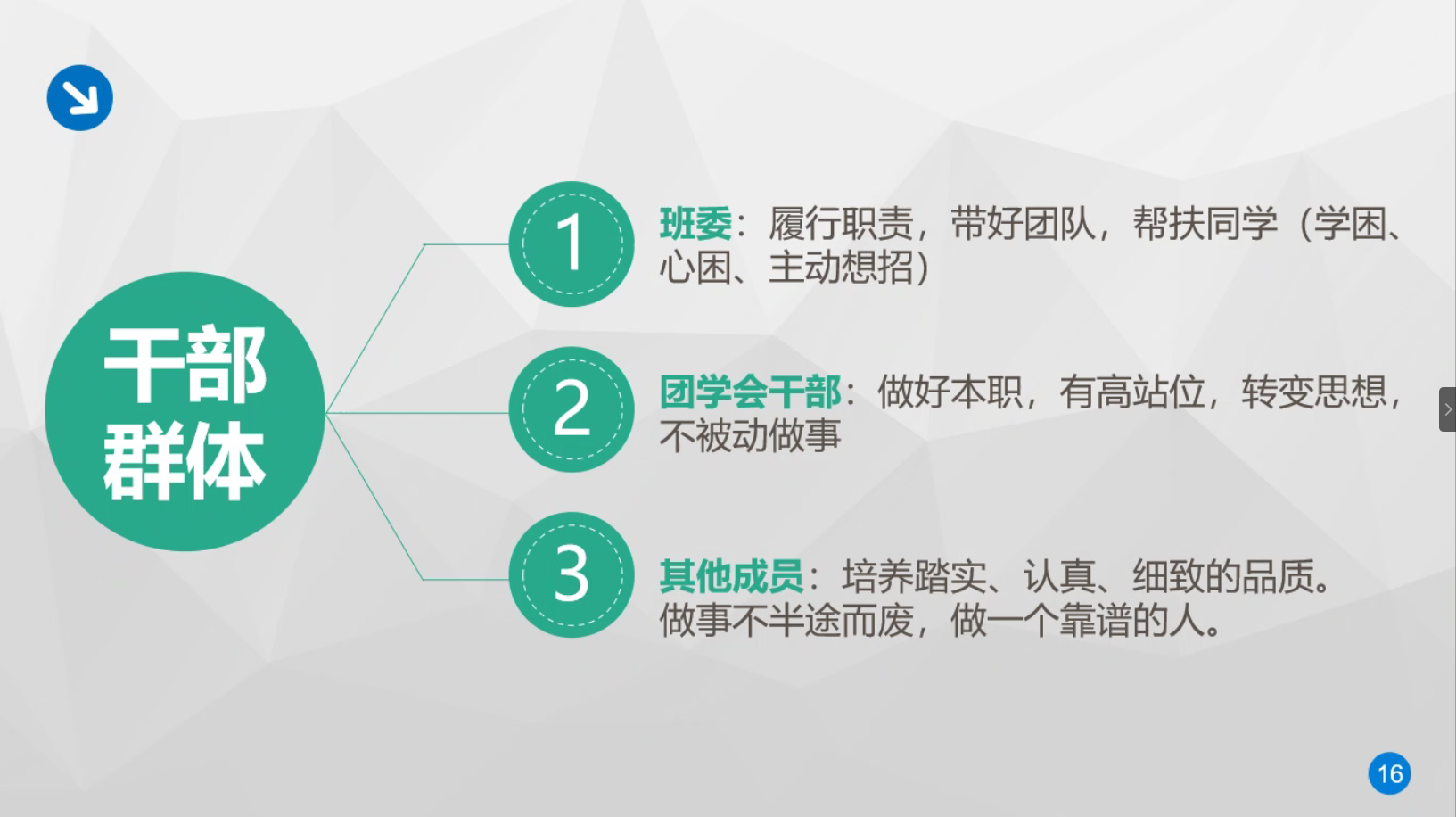 郭学斌老师还着重强调了大学生的个人规划问题,以自己的亲身经历为出发点,对同学们的本科生活提出了可靠有效的建议。他表示,作为985大学的学生,应该全方面多方位发展,锻炼自己的能力,要走出寝室,才能让自己得到真正的提升。此外,辅导员还详细地讲解了有关保研、考研等问题,希望大家保持自己初心,针对自身情况进行规划。对学生干部群体,郭学斌老师也提出了期望与要求,希望他们能够尽职尽责,提高站位,要有主人翁的意识,主动积极帮助同学。
