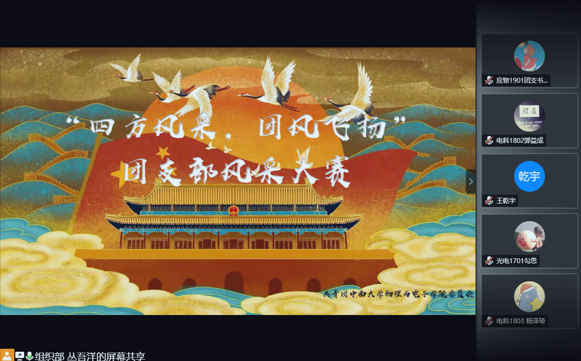 5月27日下午,物理与电子学院“四方风采,团风飞扬”团支部风采大赛在线上平台成功举办。党委副书记谢群,团委书记杨凌云,辅导员肖佳珣、彭一鸣、郭学斌参与活动并担任评委,25个团支部代表参加答辩。