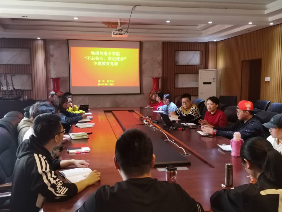10月30日下午,物理与电子学院党委副书记谢群在物理楼345会议室为本科生一支部和研究生支部讲授“不忘初心,牢记使命”主题教育专题党课。