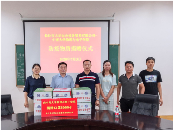 爱心企业捐赠口罩 助力学院疫情防控 2020年7月3日上午,一场简单而特殊的捐赠仪式在物理与电子学院大楼335举行,长沙市大华办公设备贸易有限公司向学院捐赠六箱计五千只口罩。院长孙克辉代表学院接受了捐...