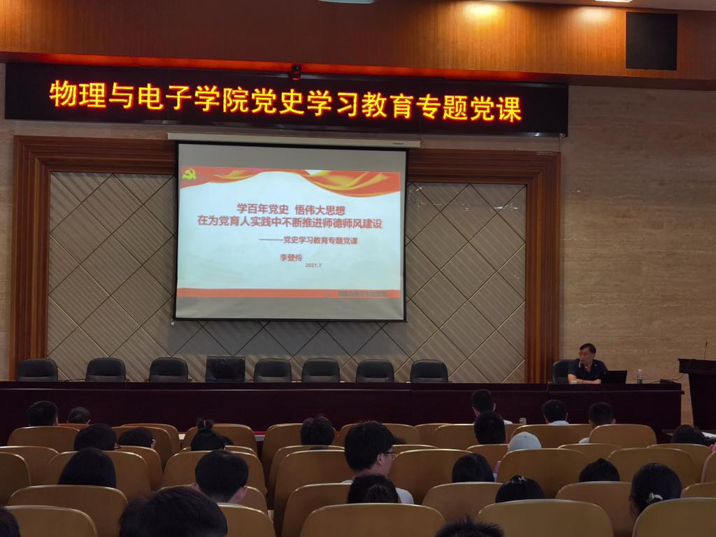 根据学校和学院工作安排,7月14日下午三点,物理与电子学院党委在物理楼116报告厅组织进行了2021年度教职工、学生党员轮训及“党史学习教育”专题党课。学院全体班子成员及学院全体党员参会。