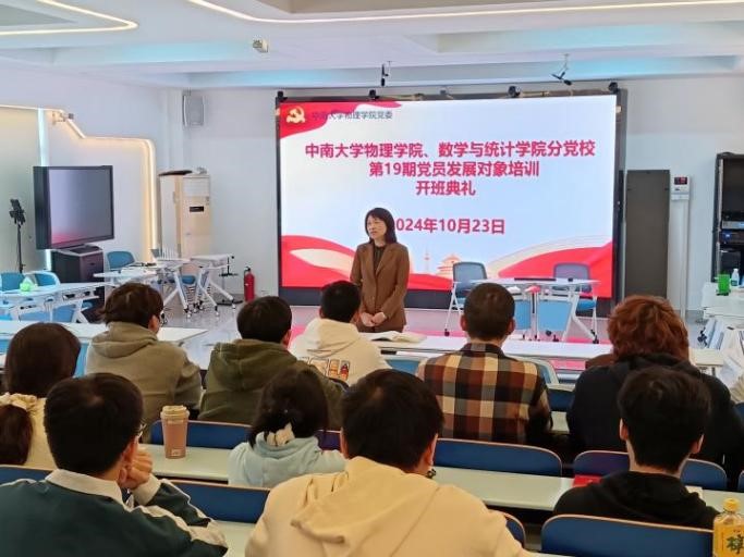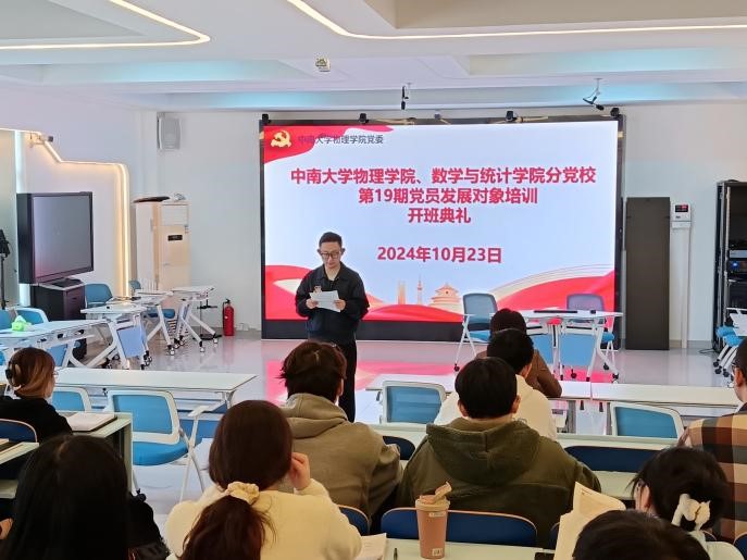 2024年10月23日下午,中南大学物理学院、数学与统计学院分党校第19期党员发展对象培训班开班典礼在新校区物理楼101教室举行。物理学院党委书记谢群、党校督导组组长戴维国出席,培训班全体学员参加,培训班班导师申友桂老师主持。