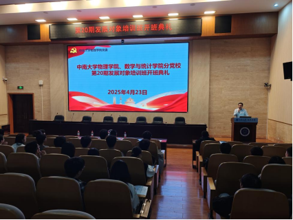 2025年4月23日下午,中南大学物理学院、数学与统计学院分党校第20期发展对象培训班开班典礼在潇湘校区物理学院116报告厅举行。物理学院党委副书记安少波,数学与统计学院组织干事赵启红,数学与统计学院研究生辅导员谢正丰以及57名培训班学员到场参加,开班典礼由培训班班导师郝记主持。