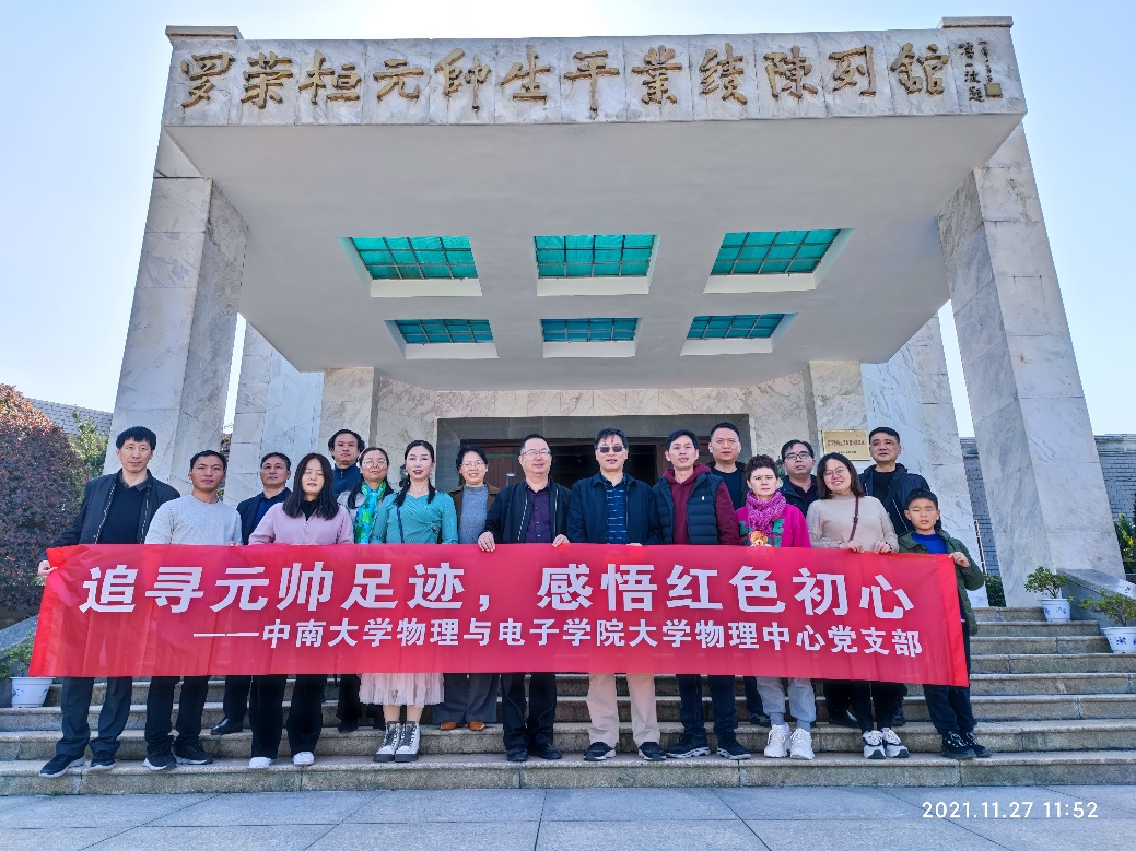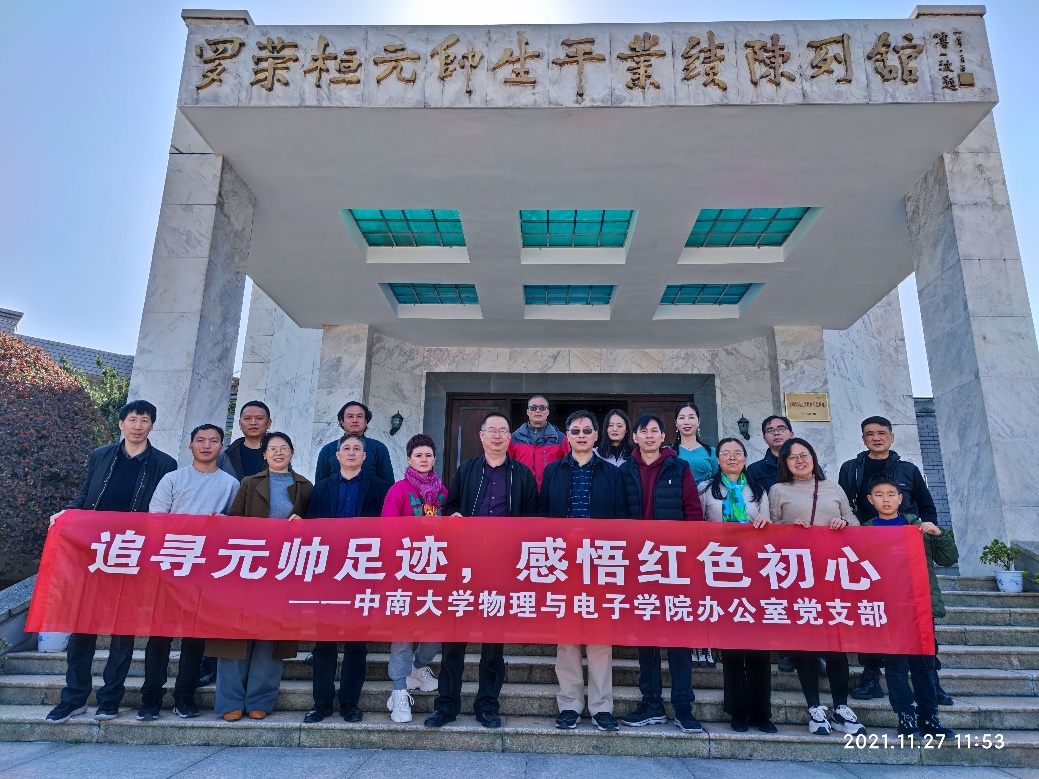 20211127日,物理与电子学院办公室党支部和大学物理中心党支部联合开展“追寻元帅足迹 感悟红色初心”主题党日活动,旨在进一步深化党史学习教育,缅怀老一辈革命精神,学习罗荣桓元帅忧国忧民、公而忘私、廉洁自律的博大情怀,倡导学史、爱国、感恩的文化理念,勉励教职工心怀大家、服务师生、积极作为,引导每一名党员在学院学校的各项建设中发挥模范带头作用。