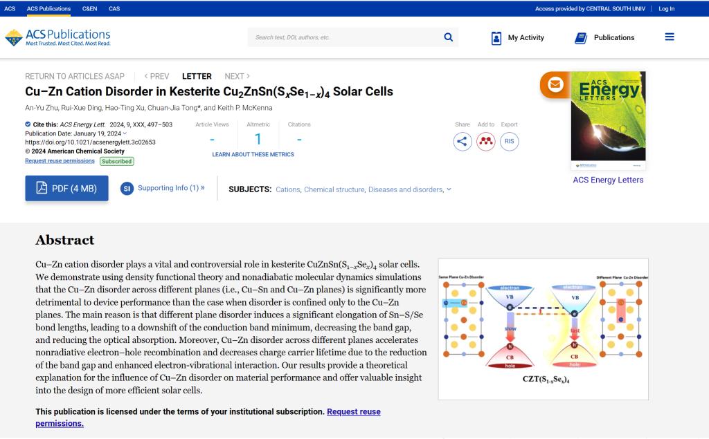 近日,我院童传佳特聘副教授带领本科生团队在JCR 1区国际高水平期刊ACS Energy Letters(IF=22)发表题为《CuZn Cation Disorder in Kesterite Cu2ZnSn(SxSe1x)4 Solar Cells》的原创论文(https://pubs.acs.org/doi/abs/10.1021/acsenergylett.3c02653)。中南大学为第一单位,两位20级本科生朱安宇与丁瑞雪为共同一作,22级本科生徐颢庭为参与作者,童传佳副教授为唯一通讯作者。