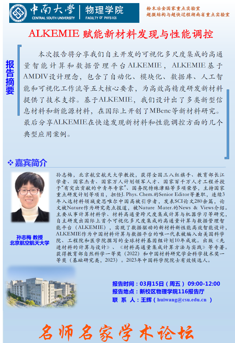 中南大学名师名家学术论坛-ALKEMIE赋能新材料发现与性能调控