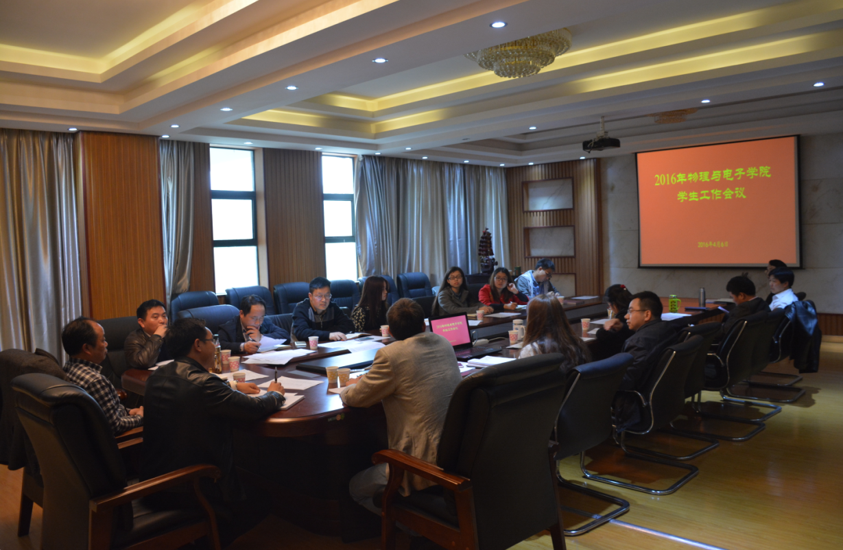 为进一步提升人才培养水平,建立健全学工、教学、科研的沟通协调机制,形成全员育人的良好氛围,4月6日下午, 2016年物理与电子学院学生工作会议在物理楼345会议室召开。全体院领导,各专业系(所)主任、支部书记、分管教学的副主任及辅导员参加了本次会议。