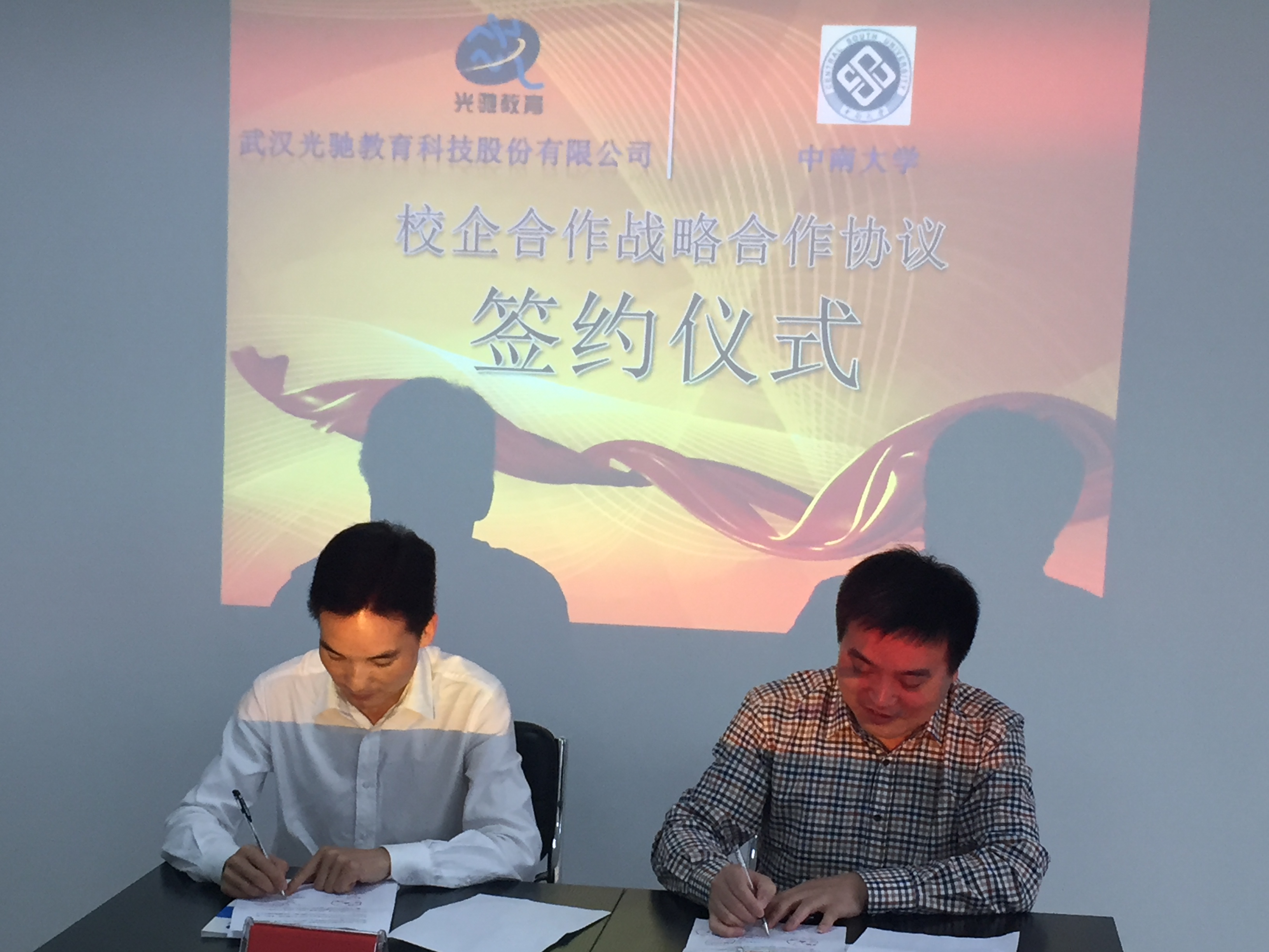 4月15日上午,中南大学与武汉光驰教育科技股份有限公司校企合作人才培养基地签字授牌仪式在武汉国家光谷新区举行,物理与电子学院副院长孙克辉教授、杨兵初教授、李宏建教授、夏辉教授、谢文科副教授等与武汉光驰李小红总经理参加了签字授牌仪式。