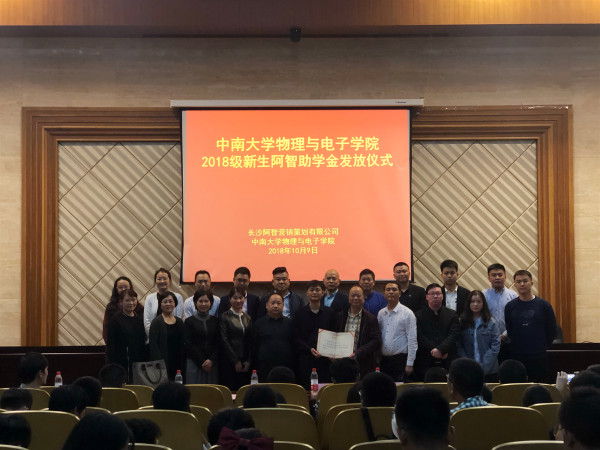 10月9日晚,物理与电子学院2018级新生阿智助学金发放仪式在物理楼116报告厅隆重举行。长沙阿智营销策划有限公司董事长郭志来一行,物理与电子院党委书记许宏武,党委副书记谢群,党委委员、副院长李长庚、邓宏贵,各年级辅导员及2018级新生、各年级学生代表参加了本次仪式。仪式由院党委副书记谢群主持。