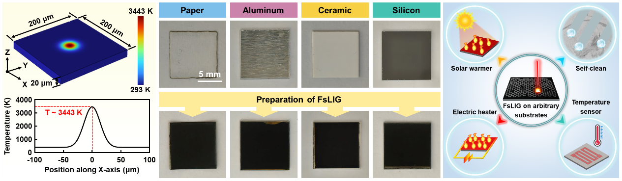 研究团队提出了利用飞秒激光表面处理在任意基底上原位构建多功能激光诱导石墨烯(LIG)的新策略。该方法几乎完全消除了LIG对基底的限制,同时最大限度地保持了石墨烯的完整性和功能,优于以往类似的研究。Raman光谱结果证实了LIG在纸、铝、陶瓷和硅等各种基底表面的成功构建。随后,以纸张为例研究了LIG的润湿性、光热转换、电热转换和温度传感特性。实验结果表明,纸基LIG材料具有高接触角(~153.4°)、高吸收率(~98.8%)、低方阻(~82.0 Ω/sq-1)以及线性温度系数(~0.089% ℃-1)。最后,我们提出的方法成功实现了纸张上的自清洁、太阳能加热、电加热和温度传感器功能,并通过LIG技术无缝集成(图3)。该进展以“In situ construction of multifunctional femtosecond laser-induced graphene on arbitrary substrates”为题于202557日发表于《Materials Horizons》。