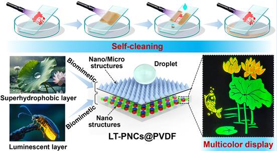 研究团队提出了一种基于飞秒激光直写(FsLDW)技术的仿生多级结构制造策略,利用飞秒激光超短脉冲与高能量密度特性精准控制表面温度,诱导钙钛矿晶体定向生长,形成发光优异的图案化阵列。针对钙钛矿本征稳定性不足,创新性提出双层仿生策略:激光烧蚀使表面形成类似荷叶的微纳分级结构,结合激光诱导含氟官能团富集及PVDF固有低表面能实现超疏水;同时,PVDF的低导热性在亚表面为CsPbX3量子点提供温和结晶环境,避免热分解,并通过激光调控实现全光谱可调多色荧光。最终制备的超疏水多色钙钛矿薄膜具备全光谱发射、优异柔性、高分辨率和自清洁能力,在复杂天气下表现出优异的耐用性(图1)。该进展以“Femtosecond Laser Atomic–Nano–Micro Fabrication of Biomimetic Perovskite Quantum Dots Films toward Durable Multicolor Display”为题于2025619日发表在《ACS Nano》。
