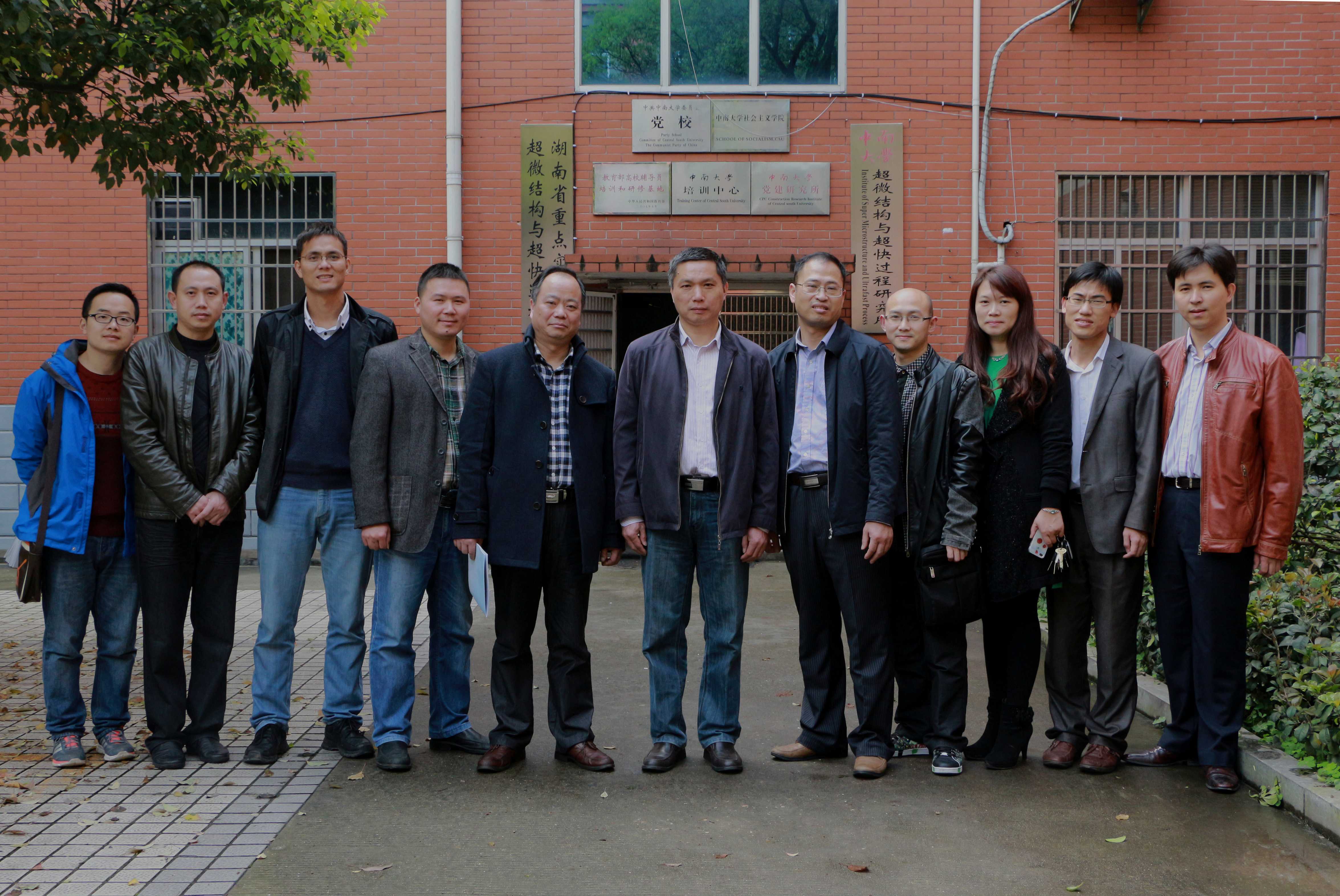 2015.3.31日江西新余学院罗玉峰校长一行在物理学院许宏武书记,谢群副书记陪同下来中南大学双超所参观交流,集体照左起为:刘仪科教授、熊春如主任、阳军亮教授、周聪华副教授、许宏武书记、罗玉峰校长、陈裕先副校长、李水根博士、谢群副书记、吴闰生博士、孟建桥教授。