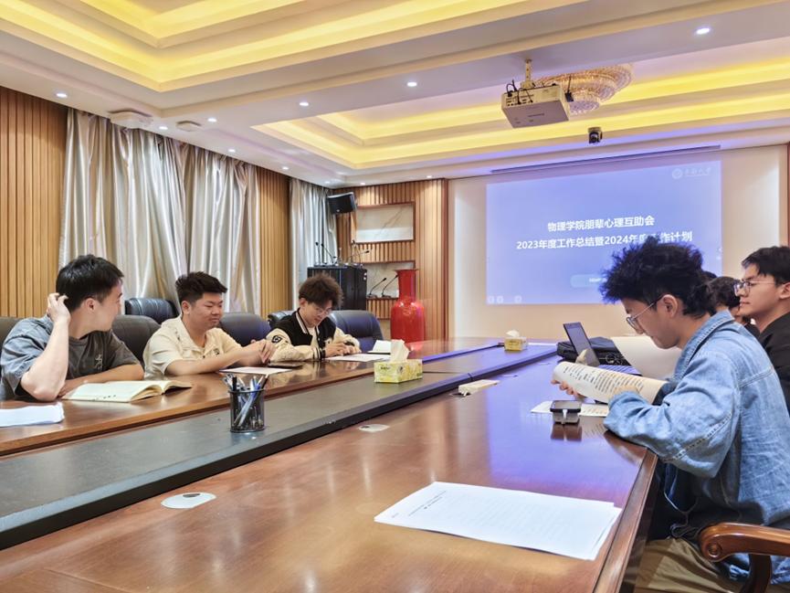 3月29日晚上9点,物理学院朋辈心理互助会在物理楼345会议室召开2023年度工作总结暨2024年度工作计划会议,参加本次会议的有心助会指导老师萧鸿猷,校心联组织部部长邹伟航,物理学院心助会会长郭嘉仪、王鹏以及各部门部长。