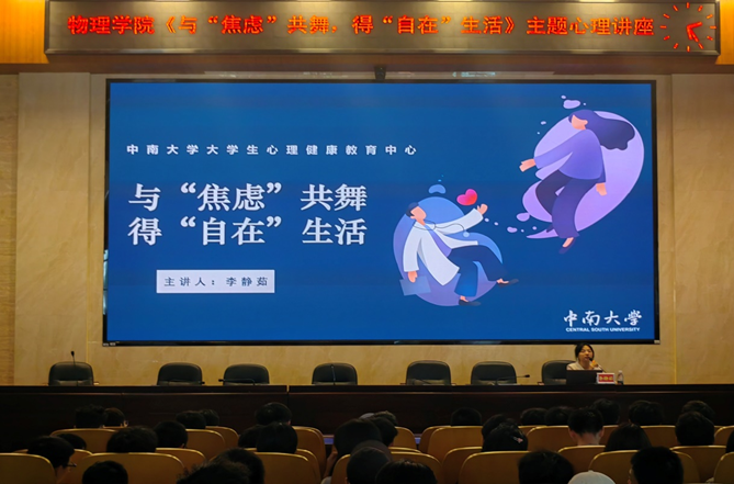 5月26日,物理学院心助会在物理楼116报告厅举办“与‘焦虑’共舞,得‘自在’生活”主题心理讲座,讲座由中南大学大学生心理健康教育中心李静茹老师主讲,学院心理健康教育专干萧鸿猷主持,2023级全体本科生参加。