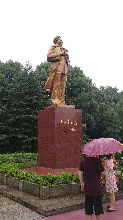 我们首先来到刘少奇铜像广场,广场庄严肃穆、视野开阔,四周青松、翠柏环抱,广场中央,刘少奇同志铜像巍然矗立。导游介绍:铜像于1988年少奇同志诞辰90周年之际落成,时任国家主席杨尚昆同志亲自揭幕。1998年,中共中央总书记江泽民为铜像题词。铜像由中华全国总工会捐建,著名雕塑大师刘开渠和他的高徒程允贤精心制作。铜像加底座高7.1米,包含两层含义:一是“七•一”是党的生日,寓意少奇同志一生致力于党的建设,是我们党的卓越领导人。二是少奇同志享年71岁,寓意他光辉伟大的一生。