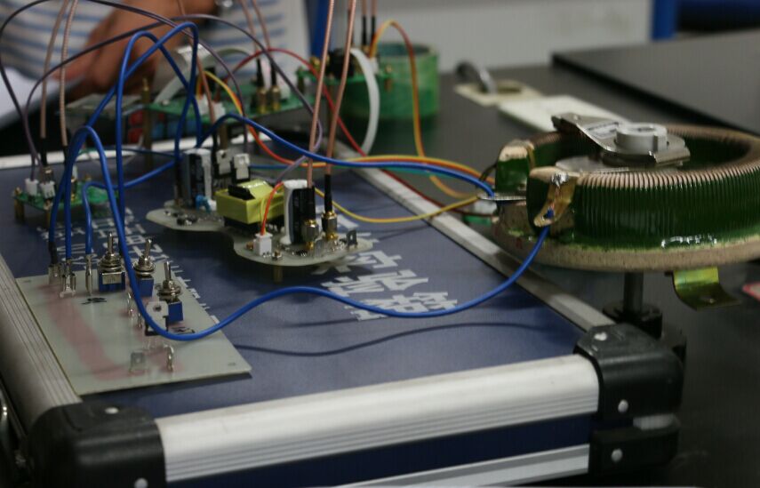 一走进他们的实验室,记者们便惊叹不已。小小的房间里竟然摆满了各种各样的仪表、仪器,黑板上还画着各种复杂的电路图。桌子上的一个小箱子不禁引起了众人的注意,原来这就是他们辛辛苦苦用半年时间设计出的作品《双向DC-DC变换器》。箱子上面连接着数不清的电线以及各种从没见过的元件,着实让记者们大开眼界。