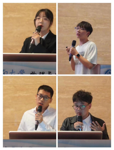 在优秀学生标兵答辩环节,四位优秀学生标兵候选人依次上台发言。他们分别从个人介绍、竞赛获奖、科研成果、课外活动等方面进行个人答辩,展现了他们优异的学习成绩、优秀的道德品质、扎实的科研学术能力、突出的创新能力以及良好的实践能力,充分彰显了属于物理学子的奋发向上、砥砺前行、博学笃行的进取精神,树立了榜样形象。