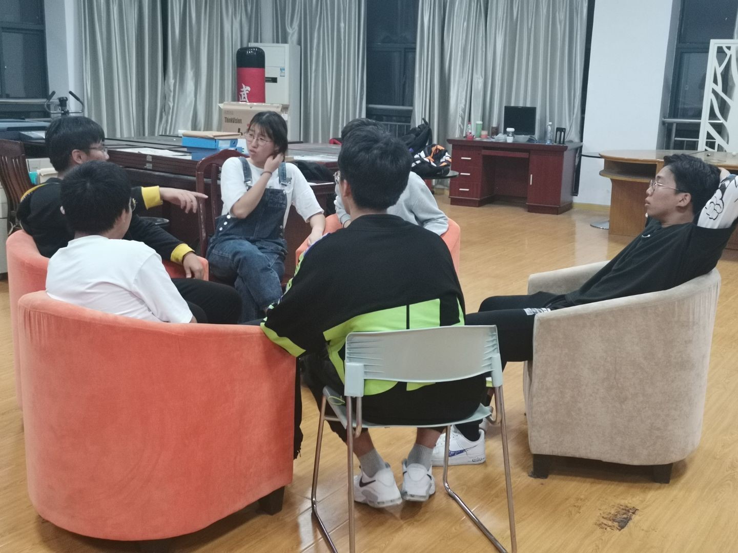 游戏环节过后,龙老师又通过报数的形式让同学们分为5组,组内成员之间互相讨论开学期间遇到的问题,并互相给出相应的解决办法。最后,由小组代表发言本组问题和解决办法,并由辅导员老师补充相关建议。同学们在这一环节中积极发言,踊跃讨论,互相吐露心声,在帮助他人的同时也收获了不少的建议,着实是受益匪浅,一举两得。