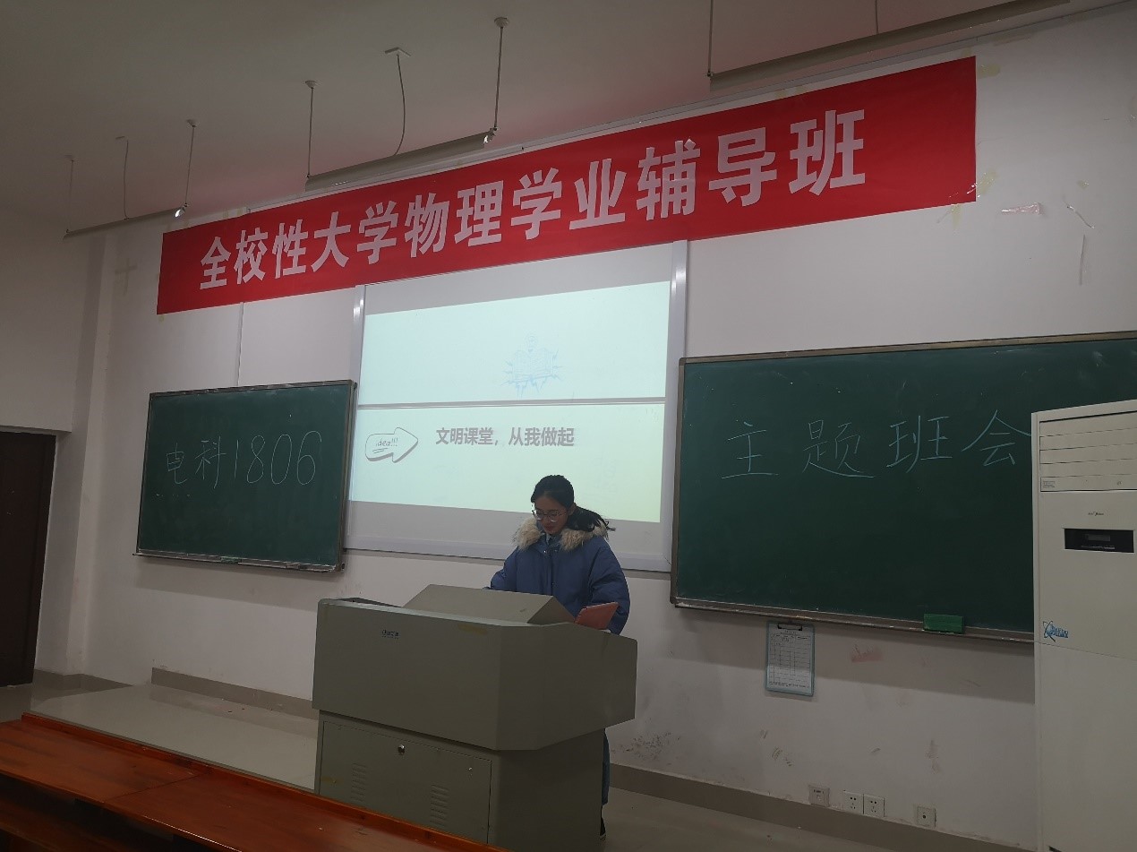 2019年12月7日,电科1806班第二次班会在物理楼123教室举办。本次班会中班长主要围绕近期校园热点展开,并强调了各类安全问题。