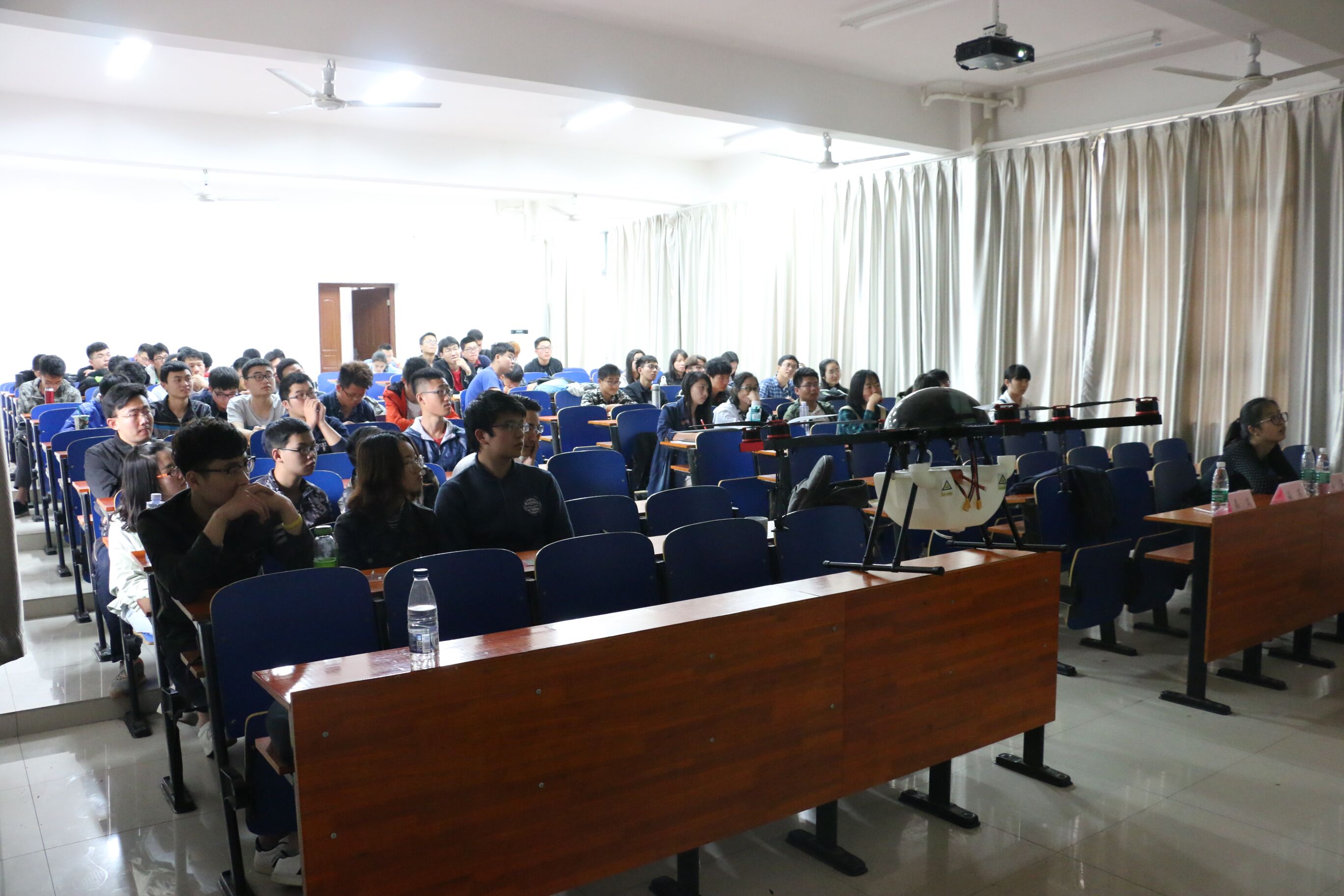 讲座伊始,主持人向同学们简单阐述了无人机的基本概念并提出了无人机系统技术先进、灵活机动、使用便捷、维护简单、性价比高、用途广泛等突出优势。继而科技讲堂便正式开始。陈定平由浅入深、旁征博引地向同学们介绍了无人机的结构组成、无人机的应用和无人机的安全注意事项。为了让同学们更深入的认识无人机,他还现场展示了他所参与创建的绿野航空公司最新研发的植保无人机,并结合多个视频实例向学生们直观真实地展示了无人机的技术与应用。讲座最后,学生们都积极参与现场互动,与嘉宾热烈探讨一些关于无人机的问题。