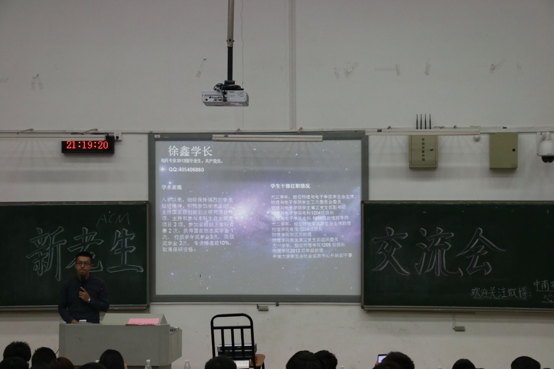 会议伊始,杨凌云老师发表简短而富有激情的讲话。他希望大家能够更好地了解大学的环境,规划好自己的生活。他说道:“本次到场的学长学姐们都是大四的优秀学子。希望通过本次交流,大家能够消除自身的疑惑,不再对自己未来感到茫然。”