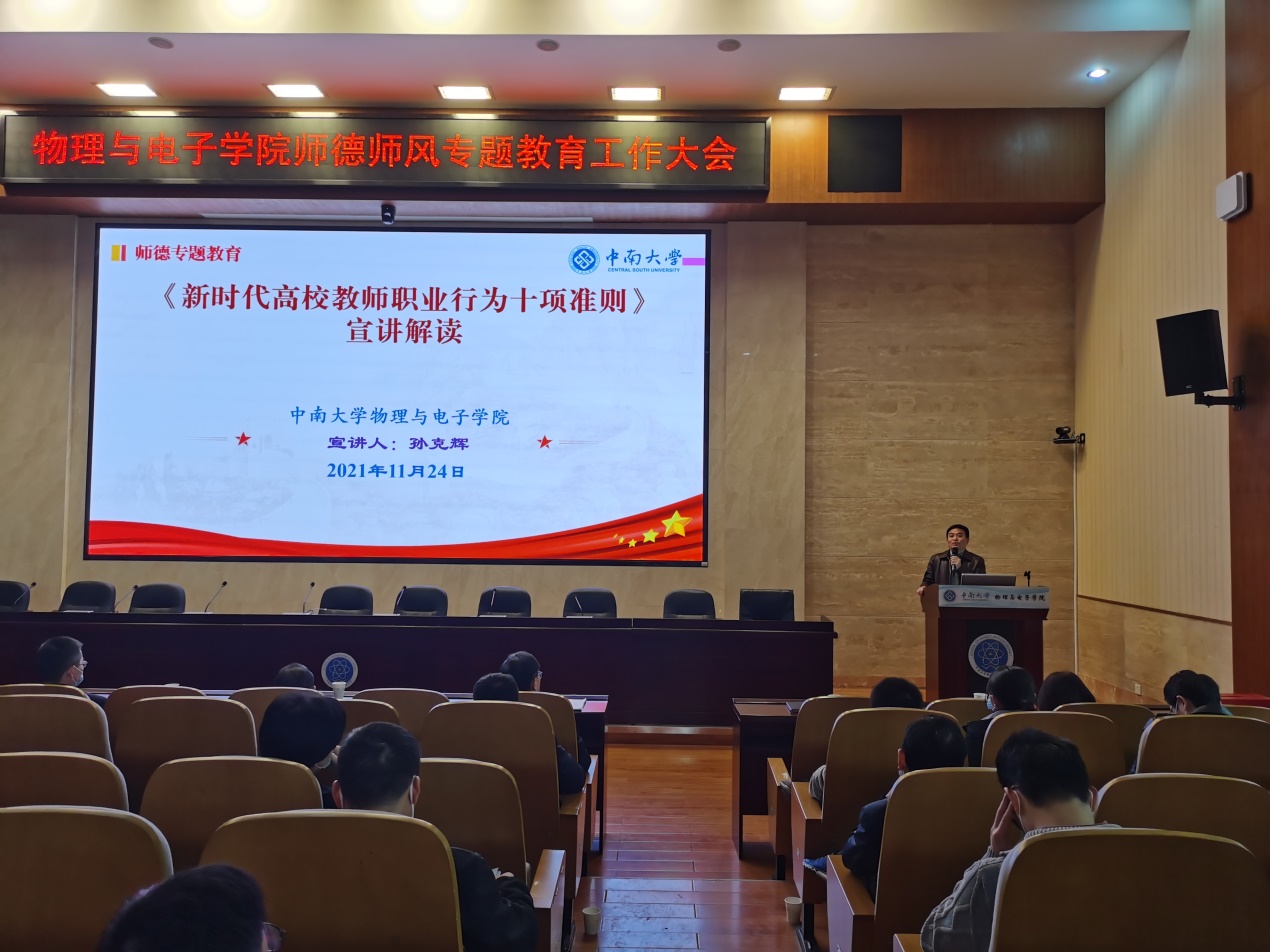 2021年11月24日下午2点半,物理与电子学院在物理楼116会议室召开警示教育及师德师风专题教育大会,全体教职员工参会,会议由李登伶书记主持。会上,孙克辉院长对教育部发布的《新时代高校教师职业行为十项准则》...