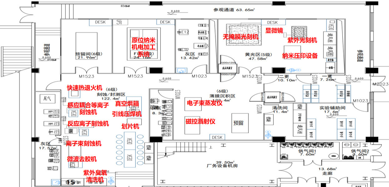 本平台超净间设置百级、千级两个洁净区域:百级区包括黄光区;千级区包括FIB区、薄膜沉积区、刻蚀/封测区、清洗间、预留间、更衣区等。并配备了厂务设备机房、供气间、灰区、排烟机房、配电间。